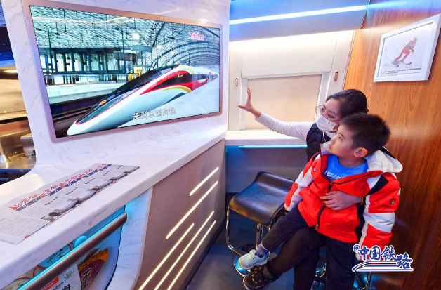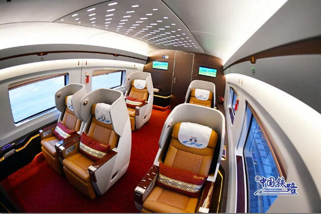 復(fù)興號智能動車組車廂內(nèi)的服務(wù)設(shè)施進行了智能化升級,進入隧道時,列車可智能控制車內(nèi)壓力,提前調(diào)節(jié)燈光、車窗顏色等。