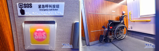 全列覆蓋免費高速Wi-Fi,旅客在旅行途中可以隨時使用電腦辦公、手機娛樂。車廂內(nèi)設(shè)有大件行李存放處、無障礙衛(wèi)生間等設(shè)施,并在殘疾人座位區(qū)配備輪椅固定裝置、SOS按鈕等。