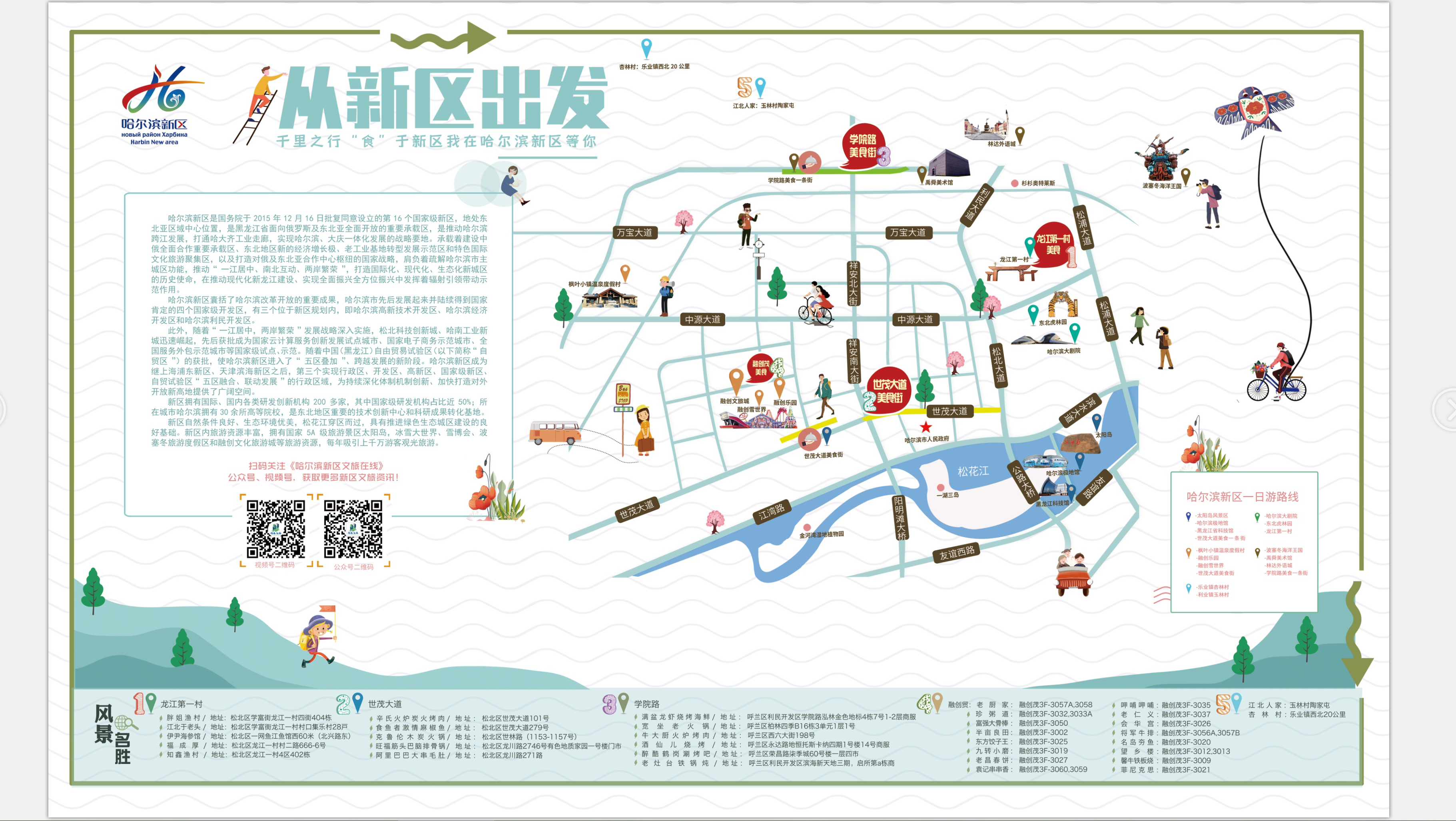 《哈爾濱新區(qū)美食地圖》以新區(qū)特色美食為主題,突出“美食+旅游”的特色結(jié)合,旨在為游客推薦新區(qū)多種多樣的優(yōu)質(zhì)美景美食,在豐富游客度假體驗(yàn)的同時(shí),叫響本土美食品牌,并推出五條“美食+”旅游度假一日游路線。通過《哈爾濱新區(qū)美食地圖》,市民和游客可以一站式了解新區(qū)的“吃住游娛購”。