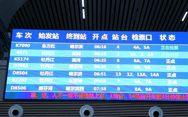 據(jù)介紹,該列車6時35分從牡丹江站出發(fā),途經(jīng)哈爾濱東、大慶、齊齊哈爾、加格達(dá)奇等共21個車站,總用時25小時23分。從漠河返回牡丹江的發(fā)車時間是18時47分,次日20時03分到達(dá)牡丹江。