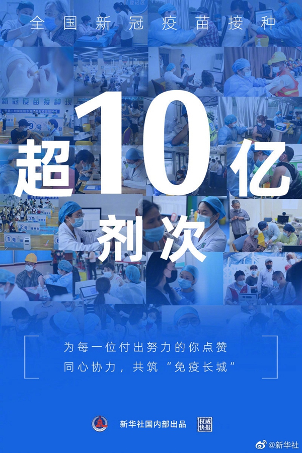 國(guó)家衛(wèi)健委6月20日通報(bào),全國(guó)新冠疫苗接種超10億劑次,這個(gè)數(shù)字來(lái)之不易。這場(chǎng)大規(guī)模接種工作,離不開全國(guó)人民的共同努力,預(yù)計(jì)年底前至少70%目標(biāo)人群接種疫苗。疫情形勢(shì)仍然嚴(yán)峻,你我同心協(xié)力,共筑“免疫長(zhǎng)城”。(記者陳席元 徐鵬航 海報(bào)設(shè)計(jì) 張晨光)