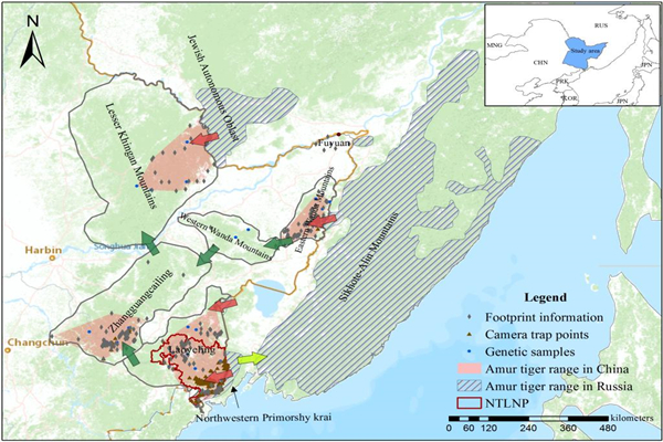 研究通過自動相機(jī)記錄的影像數(shù)據(jù)共識別出野生東北虎55只(包括20只幼體),成年個體數(shù)量從2013年的7只增加到2018年的33只,同時通過糞便樣本遺傳信息鑒定出東北虎個體30只。在此期間,種群的平均增長率為1.51%。與2000年時我國調(diào)查到12至16只野生東北虎相比,個體數(shù)量有了倍增性的恢復(fù),保護(hù)成效十分顯著。研究還發(fā)現(xiàn),我國境內(nèi)有東北虎穩(wěn)定分布的森林面積47,813 平方公里,其中老爺嶺區(qū)域18,029 平方公里;張廣才嶺區(qū)域10,941平方公里;完達(dá)山區(qū)域5580平方公里,小興安嶺區(qū)域13,263 平方公里。