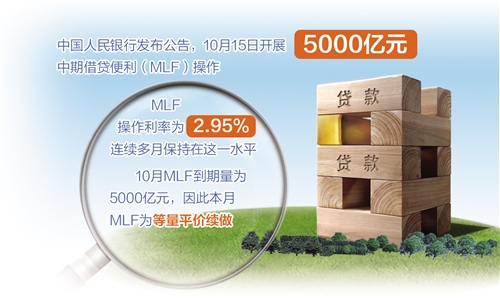10月15日,月中“麻辣粉”(MLF)如期端出。中國(guó)人民銀行發(fā)布公告稱,為維護(hù)銀行體系流動(dòng)性合理充裕,15日開(kāi)展5000億元中期借貸便利(MLF)操作(含對(duì)10月15日MLF到期的續(xù)做)。MLF操作利率為2.95%,與9月持平,并連續(xù)多月保持在這一水平。10月MLF到期量為5000億元,因此本月MLF為等量平價(jià)續(xù)做。