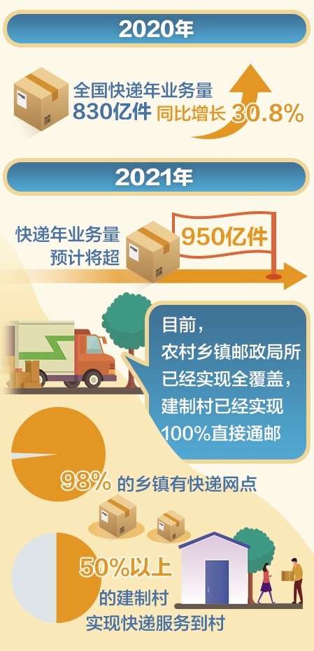 當(dāng)前,快遞年業(yè)務(wù)量以每年遞增100億件的速度持續(xù)高速增長。據(jù)國家郵政局預(yù)測,2021年快遞年業(yè)務(wù)量將超950億件。