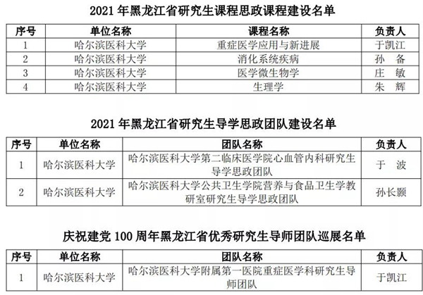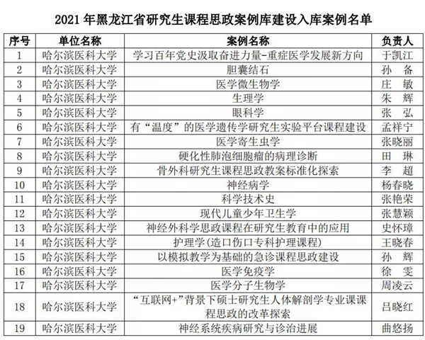 黑龍江經(jīng)濟網(wǎng)訊(黑龍江日報全媒體見習(xí)記者董廣碩 商祺)為貫徹落實國家《關(guān)于全面落實研究生導(dǎo)師立德樹人職責(zé)的意見》《高等學(xué)校課程思政建設(shè)指導(dǎo)綱要》《關(guān)于加快新時代研究生教育改革發(fā)展的意見》精神,按照《關(guān)于加快新時代黑龍江省研究生教育改革發(fā)展的實施意見》要求,日前,經(jīng)全省研究生培養(yǎng)單位遴選推薦,黑龍江省研究生課程思政教育聯(lián)盟專家委員會評審,省學(xué)位委員會、省教育廳批準(zhǔn),哈爾濱醫(yī)科大學(xué)共有26個項目獲批省級立項,其中研究生課程思政課程建設(shè)項目4個、研究生導(dǎo)學(xué)思政團(tuán)隊(導(dǎo)師)建設(shè)項目2個、研究生課程思政案例19個,慶祝建黨100周年巡展優(yōu)秀研究生導(dǎo)師團(tuán)隊1支。