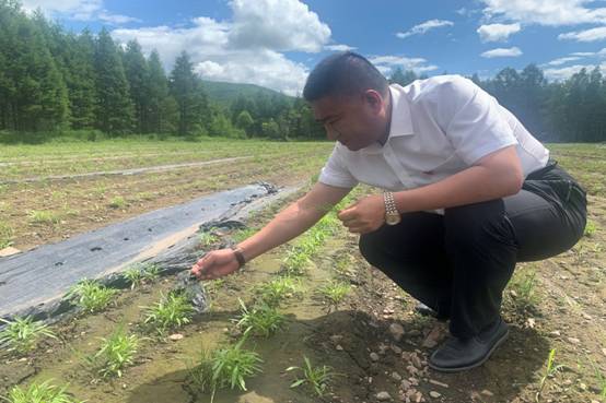 圖為關成國在古源林場興安雪菊種植基地查看雪菊長勢情況(魏樹強/攝)