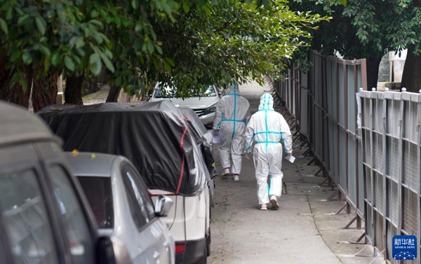 11月4日,在重慶九龍坡區(qū)九龍街道,兩名身穿防護服的青年志愿者走向自己負(fù)責(zé)的樓棟。