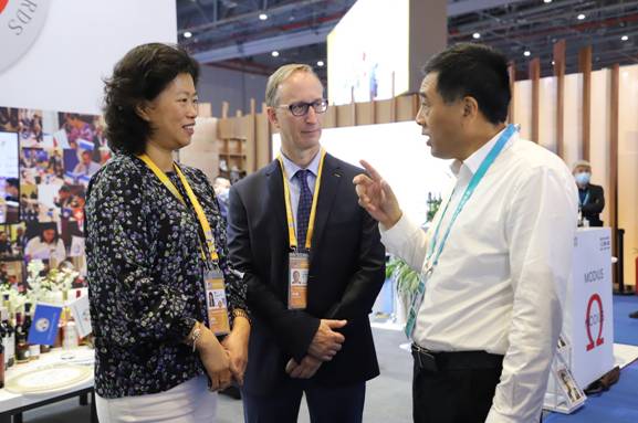 李軍、陳昱兩位集團(tuán)公司領(lǐng)導(dǎo)走進(jìn)北極冰藍(lán)莓酒莊設(shè)立在法國FIWA的站臺,向FIWA國際大獎賽主席、法國國際品評鑒定酒類專家協(xié)會主席奧利維耶·布什,以及法國FIWA SAS股份有限公司總裁張莉推介了參展的藍(lán)莓冰酒、藍(lán)莓雪酒等產(chǎn)品在剛剛結(jié)束的義烏森博會受到客戶青睞情況,尤其是重點介紹了大興安嶺地處祖國最北方,日照時間長,晝夜溫差大,天然純降水,生長出野生藍(lán)莓具有花青素含量高的特點,其產(chǎn)品藍(lán)莓冰酒、藍(lán)莓白蘭地等在法國國際葡萄酒大獎賽、有機(jī)葡萄酒大獎賽和烈酒大獎賽上斬獲大金獎、金獎。