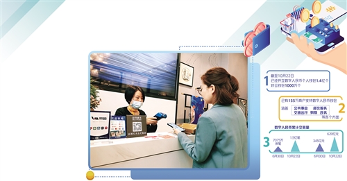 線下場(chǎng)景日益多元的同時(shí),數(shù)字人民幣交易場(chǎng)景也正在發(fā)力線上,形成了“線上+線下”并行推廣的格局?,F(xiàn)在,數(shù)字人民幣已經(jīng)可以在京東、美團(tuán)、滴滴等多個(gè)線上場(chǎng)景使用。截至10月22日,已有155萬商戶支持?jǐn)?shù)字人民幣錢包,涵蓋公共事業(yè)、餐飲服務(wù)、交通出行、購物和政務(wù)等各個(gè)方面。