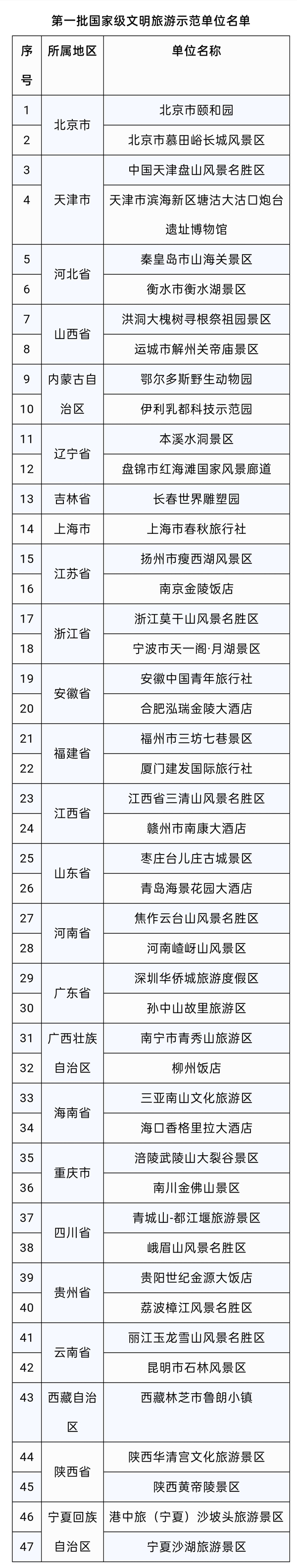 新華網訊(記者 余俊杰)記者18日從文化和旅游部獲悉,經自愿申報、省級文化和旅游行政部門審查推薦、全國旅游標準化技術委員會最終評定后,認定北京市頤和園等47家單位達到國家級文明旅游示范單位標準。