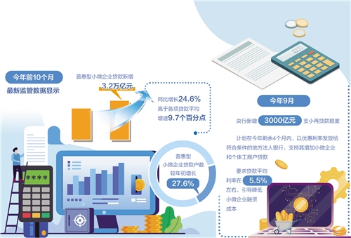 最新監(jiān)管數(shù)據(jù)顯示,今年前10個(gè)月,普惠型小微企業(yè)貸款新增3.2萬(wàn)億元,同比增長(zhǎng)24.6%,高于各項(xiàng)貸款平均增速9.7個(gè)百分點(diǎn);普惠型小微企業(yè)貸款戶(hù)數(shù)較年初增長(zhǎng)27.6%。