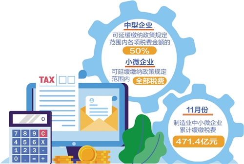 剛剛過去的11月是制造業(yè)中小微企業(yè)階段性稅收緩繳政策實施首月。12月1日,國家稅務(wù)總局發(fā)布統(tǒng)計數(shù)據(jù)顯示,這項政策實施效果顯著,制造業(yè)中小微企業(yè)已累計緩繳稅費(fèi)471.4億元。