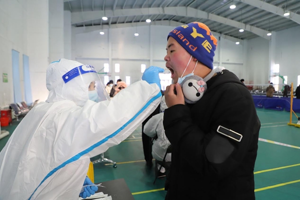 阿木爾鎮(zhèn)衛(wèi)生院醫(yī)務(wù)人員為居民采集核酸樣本(王力 攝)