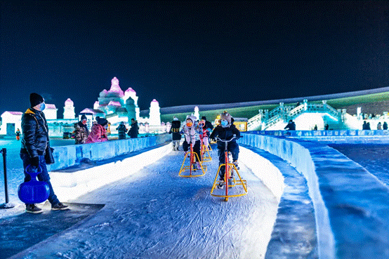 今年園區(qū)的另一個“人氣王”,非單車城堡莫屬。單車城堡內的冰上自行車項目,每天都吸引著大量游客騎行體驗。在冰面上掌控方向不是件容易事,騎著冰上自行車,穿行于美麗的冰城堡中,對游客來說是一種前所未有的奇妙體驗。