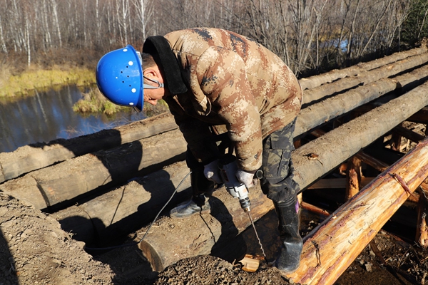 阿木爾林業(yè)局多種經(jīng)營(yíng)公司職工李訓(xùn)武在修復(fù)水毀橋梁(王力 攝)