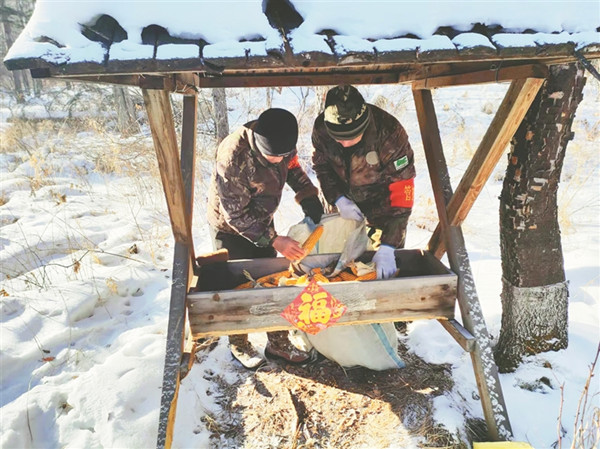 同一時(shí)間,青山林場(chǎng)的巡護(hù)隊(duì)員來到53林班補(bǔ)飼點(diǎn),貼福字,送“年貨”?!斑@過年了,狍子野豬的食物也得提檔升級(jí)。咱們過年吃餃子,它們也得吃點(diǎn)好的。”隊(duì)員王振林邊擺放著玉米、豆餅粉、白菜、蘿卜等食物邊調(diào)侃著。