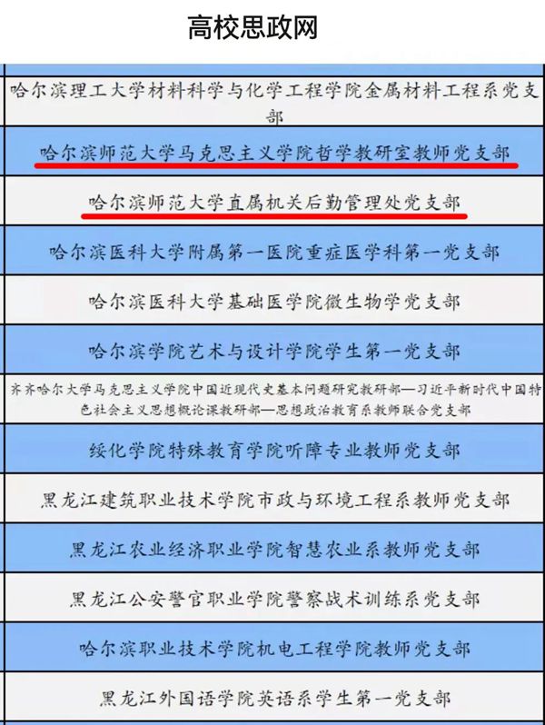 黑龍江經(jīng)濟(jì)網(wǎng)訊(黑龍江日?qǐng)?bào)全媒體見習(xí)記者董廣碩 商祺)根據(jù)《教育部辦公廳關(guān)于開展第三批新時(shí)代高校黨建示范創(chuàng)建和質(zhì)量創(chuàng)優(yōu)工作的通知》要求,經(jīng)哈爾濱師范大學(xué)校黨委組織申報(bào)、省級(jí)黨委教育工作部門推薦、資格審查、專家評(píng)審、教育部黨的建設(shè)和全面從嚴(yán)治黨工作領(lǐng)導(dǎo)小組成員單位集中審議、結(jié)果公示,遴選產(chǎn)生了全國(guó)黨建工作示范高校、標(biāo)桿院系和樣板支部。哈爾濱師范大學(xué)馬克思主義學(xué)院哲學(xué)教研室教師黨支部和直屬機(jī)關(guān)后勤管理處黨支部獲批“全國(guó)黨建工作樣板支部”。到目前為止,哈爾濱師范大學(xué)共獲批1個(gè)全國(guó)黨建工作標(biāo)桿院系,4個(gè)全國(guó)黨建工作樣板支部,1個(gè)全國(guó)研究生樣板黨支部,獲批數(shù)量居于省屬高校首位。