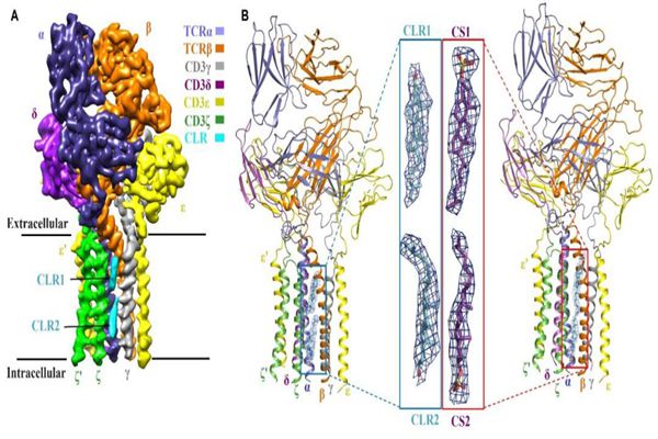 T細(xì)胞是脊椎動(dòng)物適應(yīng)性免疫的重要細(xì)胞,在病毒感染、癌癥以及自體免疫疾病中起著關(guān)鍵作用。T細(xì)胞通過其TCR-CD3受體復(fù)合物特異性識別抗原,將胞外的抗原識別信號跨膜傳遞到T細(xì)胞內(nèi),激活胞內(nèi)的適應(yīng)性免疫信號通路,啟動(dòng)免疫反應(yīng)。2019年,該課題組在《自然》(Nature)上發(fā)表了題為“人T細(xì)胞受體-共受體復(fù)合物組裝的結(jié)構(gòu)基礎(chǔ)”(Structural basis of assembly of the human TCR-CD3 complex)的研究文章,首次解析了人T細(xì)胞受體復(fù)合物(包含全部8個(gè)亞基)的高分辨率冷凍電鏡結(jié)構(gòu),揭示了TCR-CD3亞基在膜外側(cè)以及膜內(nèi)識別、組裝成功能復(fù)合物的分子機(jī)制。但一直以來,T細(xì)胞受體如何將胞外抗原信號傳遞到胞內(nèi)激活T細(xì)胞的這一關(guān)鍵機(jī)制的結(jié)構(gòu)基礎(chǔ)并不清楚。
