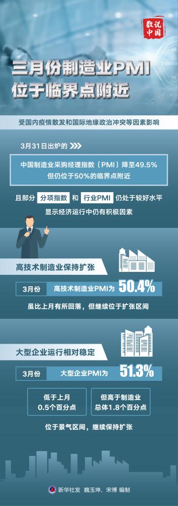 新華社北京3月31日電 (記者 魏玉坤)受國(guó)內(nèi)疫情散發(fā)和國(guó)際地緣政治沖突等因素影響,31日出爐的中國(guó)制造業(yè)采購(gòu)經(jīng)理指數(shù)(PMI)降至49.5%,但仍位于50%的臨界點(diǎn)附近,且部分分項(xiàng)指數(shù)和行業(yè)PMI仍處于較好水平,顯示經(jīng)濟(jì)運(yùn)行中仍有積極因素。