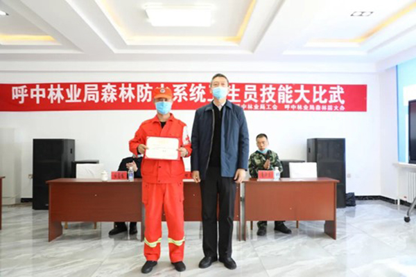 呼中林業(yè)局黨委書記魯智勇為“大比武”一等獎(jiǎng)?lì)C獎(jiǎng)(孫樹輝 攝)