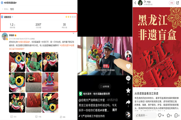 “黑龍江冰雪非遺盲盒”是省文旅廳在第二屆冰雪非遺節(jié)期間,依托黑龍江省豐富的非物質(zhì)文化遺產(chǎn)資源,推出的創(chuàng)意營(yíng)銷活動(dòng)?;顒?dòng)期間,甄選了陳氏布藝、樺樹(shù)皮畫(huà)、剪紙、鰉魚(yú)等黑龍江非遺產(chǎn)品,涵蓋了藝術(shù)品、美食等多種品類,通過(guò)官方微博及微信公眾平臺(tái)策劃線上招募“非遺體驗(yàn)官”、非遺問(wèn)答游戲等多種形式活動(dòng),隨機(jī)發(fā)放盲盒,充分展示了龍江非遺的獨(dú)特魅力。