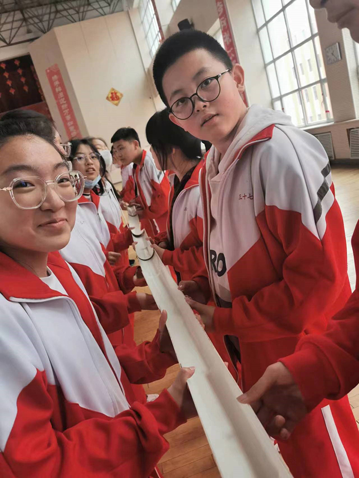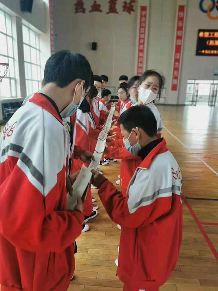 游戲規(guī)則為所有人站成一排,每人一根引導(dǎo)槽,在起點(diǎn)的引導(dǎo)槽上放置一個乒乓球,在終點(diǎn)放一個水杯,第一名隊(duì)員使用引導(dǎo)槽將乒乓球傳遞給下一位,傳遞時(shí)不能用手碰觸乒乓球,也不能使其掉落回流,當(dāng)最后一名隊(duì)員將乒乓球傳入到水杯里,才算成功,用時(shí)最短的隊(duì)伍獲勝。