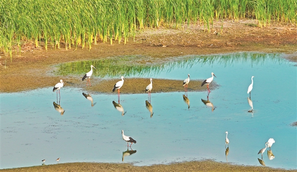“此次現(xiàn)身的東方白鸛數(shù)量有近百只,且已在濕地停留10余日。以往東方白鸛只有在春秋遷徙季節(jié)才經(jīng)停安邦河濕地,在這個(gè)季節(jié)現(xiàn)身,屬史上首次?!卑舶詈訚竦刈匀槐Wo(hù)區(qū)管理局旅游科科長(zhǎng)王偉介紹。