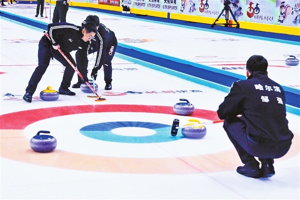 圖為男子冰壺哈爾濱隊(duì)比賽現(xiàn)場(chǎng)。(胡錫韋/攝)