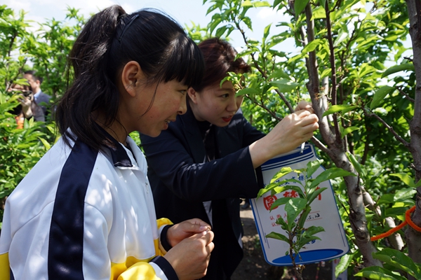 儀式后,與會領(lǐng)導(dǎo)和孩子們一同參觀青春果園,在“希望”“圓夢”“愛心”等六棵樹下共同掛上“哈藥小藍瓶”手工制品。