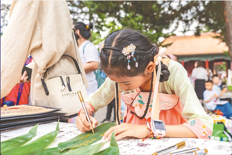本報10日訊(記者 董云平)對古詩摘“高粽”香囊、體驗古風花鈿、沐蘭湯凈手、粽葉寫祝福、解鎖端午限量印章、領取端午彩絲……10日,省民族博物館融合傳統(tǒng)習俗與現(xiàn)代創(chuàng)意,開啟沉浸式“端午文廟行:粽情畫意 古韻新體驗”,多彩傳統(tǒng)民俗、非遺文化將活動現(xiàn)場節(jié)日氛圍感拉滿,帶給大家端午出游“新”體驗。