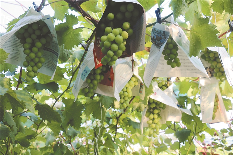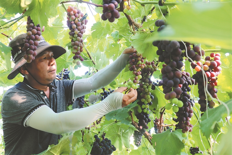 “春棚栽培的葡萄在8月中旬成熟,而在暖棚里,由于溫度、濕度得到科學(xué)精準(zhǔn)控制,葡萄成熟得更早,產(chǎn)量更高。7月10日左右即可上市,搶占市場空缺。”蔬菜公司負(fù)責(zé)人王軍強(qiáng)邊說一邊拿起手機(jī)拍攝,為一周后葡萄上市進(jìn)行宣傳。