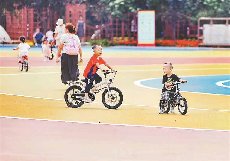 孩子們在廣場上騎單車。