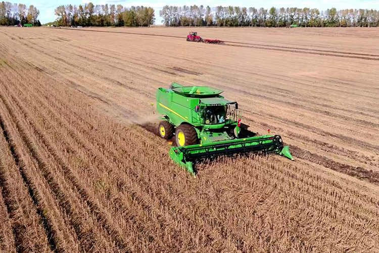 也正如老李說的,糧食豐產(chǎn)豐收,離不開農(nóng)業(yè)的科技支撐。在取得2023年全國農(nóng)墾提單產(chǎn)“大比武”優(yōu)勝農(nóng)場的基礎(chǔ)上,引龍河農(nóng)場有限公司黨委按照省委農(nóng)村工作會議、北大荒集團(tuán)、北安分公司備春耕生產(chǎn)工作推進(jìn)會議精神,以振興中國大豆產(chǎn)業(yè)為己任,落實落靠“穩(wěn)糧擴(kuò)豆”任務(wù),將大豆大面積單產(chǎn)提升作為農(nóng)業(yè)生產(chǎn)的主攻方向。2024年,這個農(nóng)場大豆一年“重茬”面積5.7萬畝,占大豆播種面積的18.23%;兩年“重茬”面積6.9萬畝,占大豆播種面積的21.91%;兩年以上“重茬”面積9.2萬畝,占大豆播種面積的29.22%。為更加有效應(yīng)對大豆重茬,農(nóng)場通過應(yīng)用重茬大豆提單產(chǎn)的各項措施,例如底肥增施生物有機(jī)肥和微生物菌肥,花期噴施大量元素水溶肥和微生物菌劑,大豆的產(chǎn)量有了非常明顯的提升,成熟度非常好,而且百粒重提高了1.5克,單數(shù)平均增加了1.9個莢數(shù)和3.48個粒數(shù)。與此同時,還以深松為重點,結(jié)合翻、耙、旋、起、壓等措施,提高整地質(zhì)量,打破板結(jié)層,增加土壤透氣性,奠定大豆播種基礎(chǔ),為大豆萌發(fā)和根系生長創(chuàng)造良好的土壤條件,并選擇土壤有機(jī)質(zhì)含量高地塊種植“重茬”大豆。合理安排大豆播種順序,先播種正茬大豆,待溫度回暖后再播“重茬”大豆,避免低溫冷量“重茬”病害的疊加。