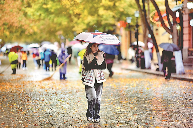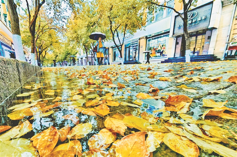 雨中秋意濃。10日一場秋雨,哈爾濱街道兩側(cè)的樹葉紛紛飄落,滿地落葉如同一層金色地毯,為秋日冰城增添了更多魅力。外出的人們撐起五顏六色的雨傘,走在落葉間,構(gòu)成了一幅幅美麗的油畫。
