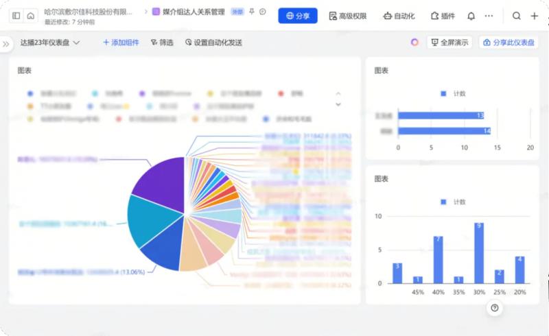 由于器械字號產(chǎn)品的特殊性,現(xiàn)在敷爾佳通過飛書在線文檔審批達人,將達人數(shù)據(jù)填寫上報,上級在線同步審批達人,跟進確定合作。直播中,用飛書云盤儲存資料,將達播錄屏,產(chǎn)品資料等數(shù)據(jù),同步云盤,方便各部門查看,調(diào)取相關資料。直播后,利用飛書多維表格將達人信息,合作傭金,產(chǎn)出 GMV,對接人等重要信息歸攏一起,形成多維表格方便組織內(nèi)互相查閱填寫, 通過儀表盤的功能體現(xiàn)出哪些達人是優(yōu)質(zhì)合作達人,并為二次投放合作提供了參考價值。