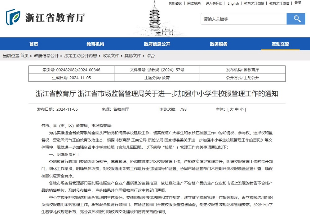 作為服裝產(chǎn)業(yè)發(fā)達(dá)省份,浙江省一直注重校服質(zhì)量。如2014年浙江省教育廳聯(lián)合浙江省質(zhì)量技術(shù)監(jiān)督局發(fā)布《關(guān)于進(jìn)一步加強學(xué)生服裝和床上用品管理工作的通知》;2018年,浙江省質(zhì)監(jiān)局聯(lián)合教育廳、工商局聯(lián)合發(fā)布了《浙江省學(xué)生服質(zhì)量提升行動工作方案》;2022年10月,浙江省《教育收費政策(2022年)》規(guī)定學(xué)校收取服務(wù)性收費和代收費,堅持學(xué)生自愿和非營利原則,不得與學(xué)費、住宿費合并統(tǒng)一收取,不得從中牟利。