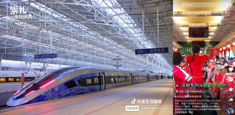 在線下,活動還聯動崇禮區(qū)政府、延邊州商務局、齊齊哈爾網信辦落地雪國專列,覆蓋復興號、民俗專列、高鐵站等不同場景,讓游客和市民感受濃濃冰雪氛圍,自發(fā)為當地文旅種草,吸引更多雪友來到小城看見好風光。截至活動收官,“開往崇禮站的雪國專列”熱度達827萬,一度登上抖音河北多地同城榜TOP1。