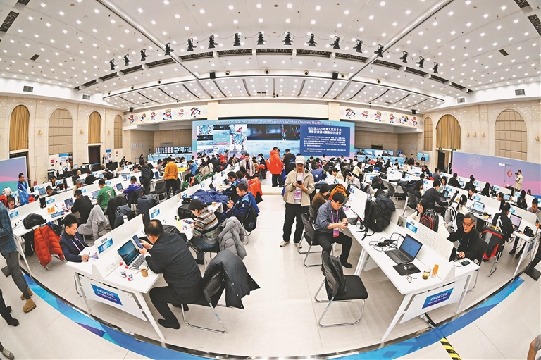 第九屆亞冬會主媒體中心(MPC)分為主新聞中心和國際廣播中心兩個部分,為注冊媒體記者和轉(zhuǎn)播商的工作提供保障服務(wù)。亞冬會開幕后,MPC里就坐滿了來哈爾濱采訪的各國記者,他們在這里寫稿,向各地發(fā)送有關(guān)亞冬會的最新信息和比賽結(jié)果,他們也在這里相互交流,成為異國朋友。
