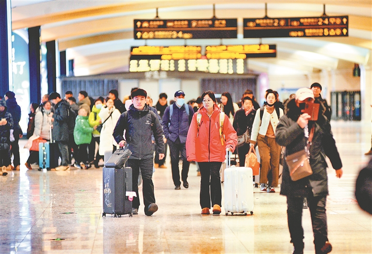 26日,哈爾濱火車站出站口,許多大學生推著行李箱,走出車站,返回學校,開啟新學期的學習生活。