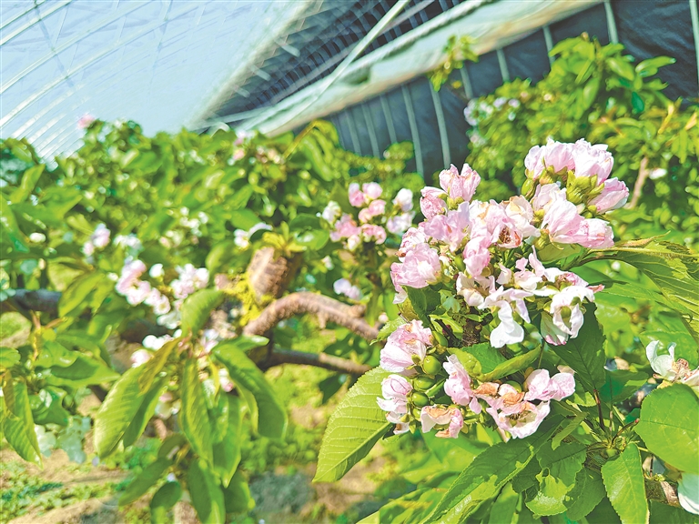 日前,湯原縣湯旺朝鮮族鄉(xiāng)大棚采摘園里櫻桃花大片盛開,吸引游客到此打卡拍照。據(jù)了解,該采摘園共有11棟大棚,種植1000余棵大櫻桃。櫻桃成熟后,果子個頭兒大,果肉厚實、硬度大,口感甜蜜,單體重量達到18克以上,年產(chǎn)量超7000斤,且耐儲存不易開裂,受到市場青睞。
