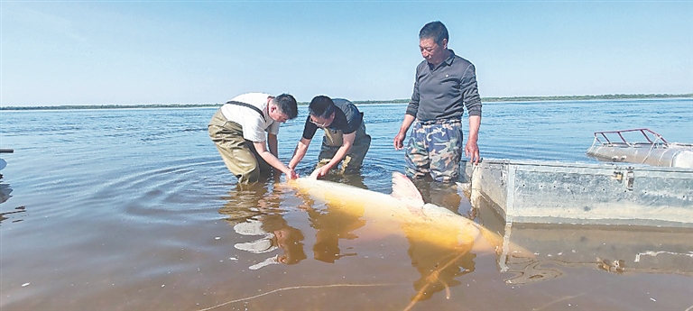 在黑龍江省水生動物資源養(yǎng)護中心技術人員的精心救治與蘿北縣和遜克縣漁政部門的協同努力下,這兩尾達氏鰉完成救治后,被及時放歸黑龍江干流蘿北段、遜克段,重歸自然。