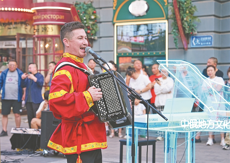 中央大街一隅,熱情洋溢的俄羅斯演員或奏響悠揚的巴揚樂曲,讓充滿異域風情的旋律在空氣中流淌;或以靈動的舞姿演繹俄羅斯文化,用熱情奔放的節(jié)奏點燃現(xiàn)場氣氛。市民和游客近距離感受俄羅斯文化的魅力。