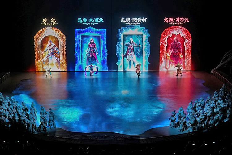 2.0版本《王的戰(zhàn)車》以北方部落的古老傳說為藍本,將傳統(tǒng)技藝與現(xiàn)代科技巧妙融合,既保留了傳統(tǒng)雜技的力量與驚險,又通過全息投影技術(shù)、天幕+地屏等科技手段賦予其全新的藝術(shù)表達。