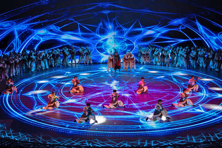 全新的演出以游戲玩家視角展開,當(dāng)游戲開始,巨大的環(huán)形地幕瞬間點亮,蒼茫的北境雪原鋪展開來,激光投影在穹頂交織出流動的光幕,與升騰的煙霧交融,千年前的部落場景躍然眼前。