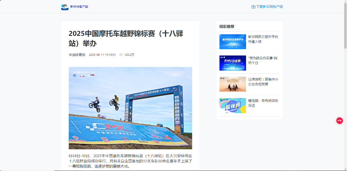 ——主題宣傳聲勢(shì)強(qiáng)勁,上央媒、亮品牌。聚焦生態(tài)建設(shè)、產(chǎn)業(yè)發(fā)展、先進(jìn)典型等,深挖工作亮點(diǎn),全媒體發(fā)稿量超3800篇,其中國(guó)家級(jí)媒體310余篇、省級(jí)媒體270余篇?!?025中國(guó)摩托車越野錦標(biāo)賽舉辦》《小熊下樹!哎喲喲下得挺快》等作品登上央視新聞、新華社、光明網(wǎng)、學(xué)習(xí)強(qiáng)國(guó)、中國(guó)綠色時(shí)報(bào)等國(guó)家級(jí)平臺(tái);2025中國(guó)摩托車越野錦標(biāo)賽、文藝演出等活動(dòng)通過(guò)新華社現(xiàn)場(chǎng)云等平臺(tái)直播,總點(diǎn)擊量超300萬(wàn)次,“十八驛站”知名度與美譽(yù)度顯著提升。