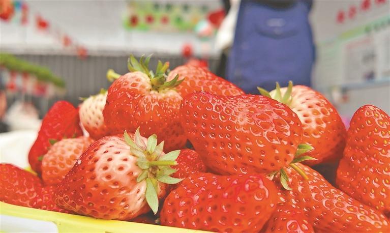 “這還有個(gè)大的,可紅啦。”翠綠的草莓架下,小朋友拎著籃子來(lái)回穿梭,游客一邊采摘一邊品嘗。這里的草莓潔凈鮮亮,摘下來(lái)不用洗就能直接吃,咬一口,清甜的草莓汁溢滿唇齒。