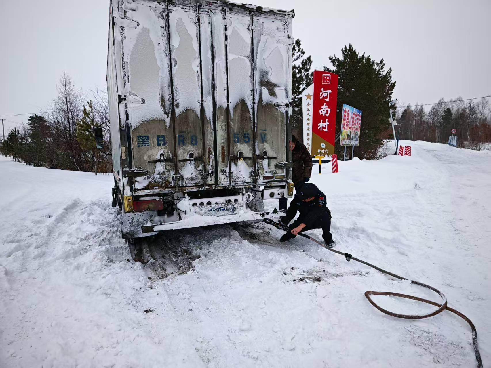 交警大隊(duì)接到G331國道河口執(zhí)勤點(diǎn)求助稱有一輛廂式貨車因積雪過厚、路面濕滑、不慎陷于深雪中無法移動(dòng),導(dǎo)致車輛被困。