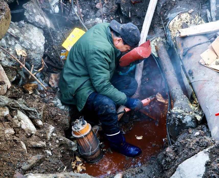 搶修現(xiàn)場(chǎng),機(jī)械與人力協(xié)同發(fā)力。小型挖掘機(jī)破土作業(yè),挖開(kāi)近2米深的作業(yè)面,精準(zhǔn)定位蒙板漏水點(diǎn)。10余名搶修人員腳穿水靴,一邊操作水泵排水,一邊用鍬鎬擴(kuò)大作業(yè)空間,爭(zhēng)分奪秒推進(jìn)搶修進(jìn)程。為搶抓進(jìn)度,搶修人員放棄午休和周日休息,全程堅(jiān)守一線,先后完成開(kāi)口、安裝臨時(shí)閥門(mén)等關(guān)鍵工序,待供暖主管水凈后,迅速開(kāi)展焊接作業(yè),精準(zhǔn)修復(fù)10多公分長(zhǎng)的破裂處,最終完成焊接、保溫及現(xiàn)場(chǎng)恢復(fù)工作。