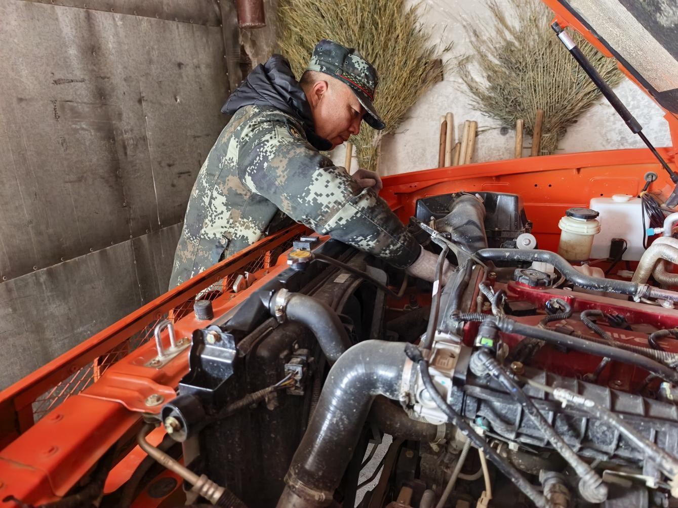 林場(chǎng)技術(shù)人員正在檢修維護(hù)防火車輛(柏松 攝)
