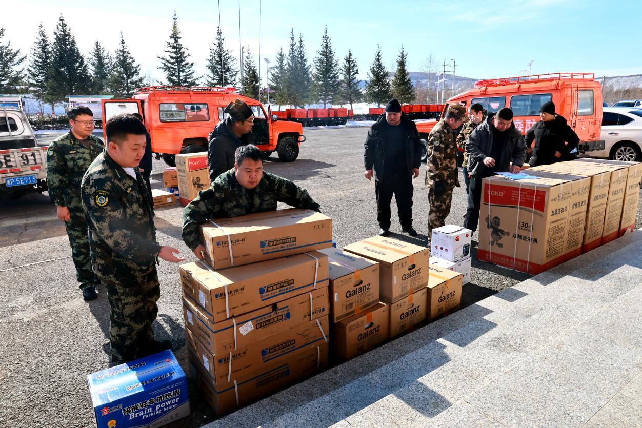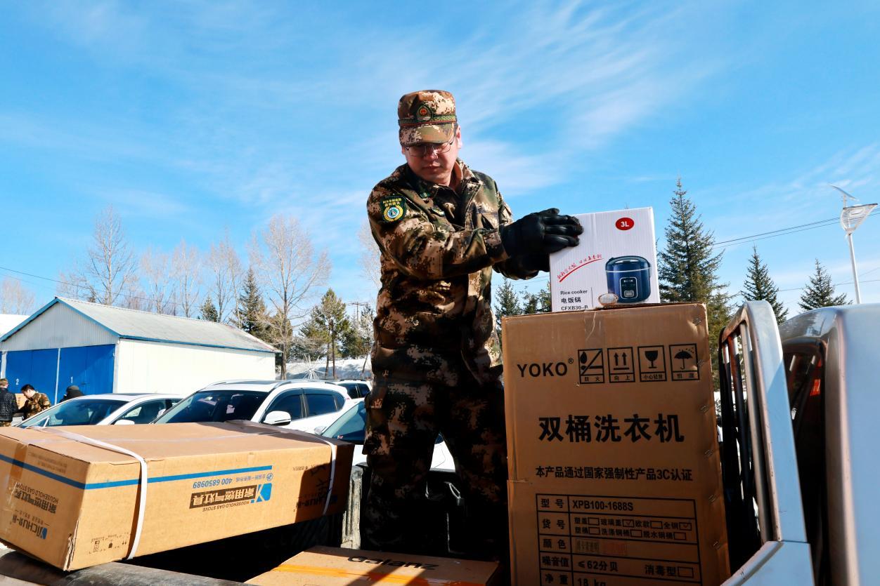 阿木爾林業(yè)局林場(chǎng)職工正在將領(lǐng)取的物品裝車(王力 攝)